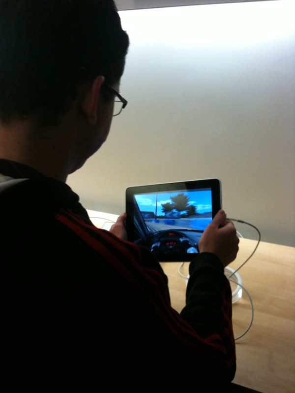 O outro jogo foi algum de corrida (desculpem, mas não lembro do nome =P), com um controle simples: o carro já acelera e freia sozinho, seu único trabalho é segurar o iPad como se fosse um volante, e girar o iPad como um volante (dã) para virar o carro. Bem díficil de controlar, como voces devem imaginar. E sem acelerar e freiar não tem muito graça (pode ser que tenha outras opções de controle…). Gráficos 3D interessantes, com visão dentro do carro (lembro que dava para ver o volante e as mãos do piloto), mas a pista não achei grande coisa. Ah, e segurar o iPad assim não atrapalha a visão, já que existe essa área em preto em volta da tela, que é larga o suficiente para por as mãos sem esconder boa parte da tela.